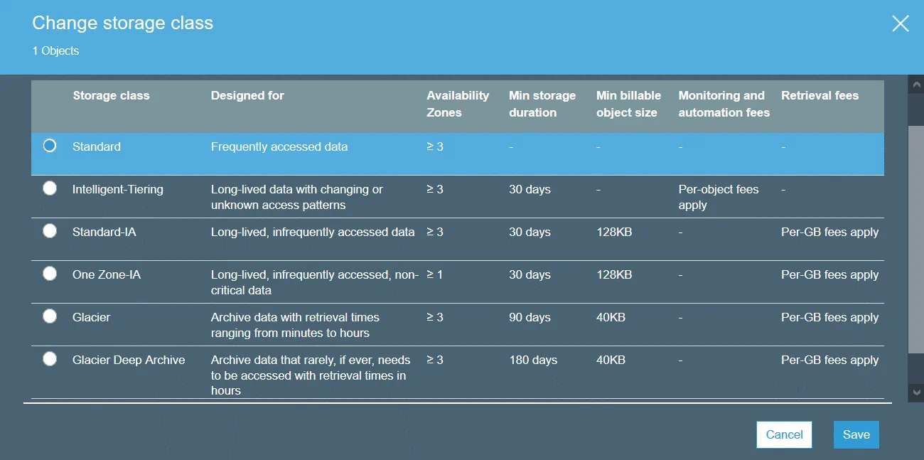 S3 Standard-IA (acceso infrecuente) puede utilizarse para almacenar datos a los que se accede con menos frecuencia que en S3 Standard. S3 Standard-IA está optimizado para un periodo de almacenamiento más largo. La recuperación de datos almacenados en la clase de almacenamiento S3 Standard-IA tiene un coste. Además, tanto en S3 Estándar como en S3 Estándar-IA hay que pagar por las solicitudes de datos (PUT, COPY, POST, LIST, GET, SELECT).