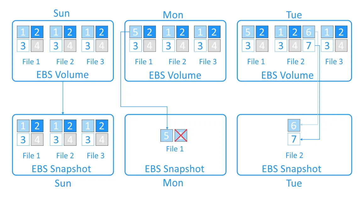 Una instantánea de EBS es una copia puntual de un volumen de Amazon EBS, que se copia perezosamente en Amazon Simple Storage Service(Amazon S3). Las instantáneas de EBS son copias incrementales de datos, lo que significa que en la siguiente instantánea de EBS sólo se almacenan los bloques únicos de datos del volumen EBS que han cambiado desde que se tomó la última instantánea de EBS.