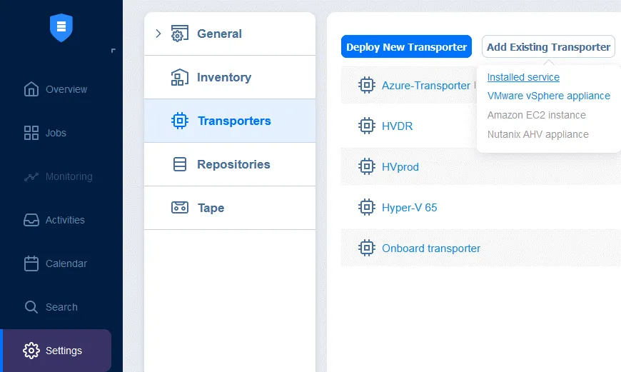 Ahora, podemos configurar NAKIVO Backup & Replication para utilizar el nuevo recurso compartido de Azure como nuevo repositorio de backups. En primer lugar, añadimos el Windows Transporter local creado previamente yendo a Settings > Transporters > Add Existing Transporter > Installed service.