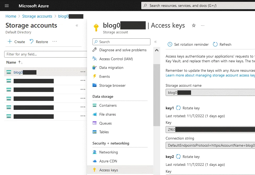 NOTA: También puede encontrar la información de sus claves de acceso para conectarse haciendo clic en el nombre de la cuenta de almacenamiento > Access keys y, a continuación, verá sus claves de acceso, es decir, las contraseñas, en la ventana de la derecha, en las secciones de claves correspondientes.