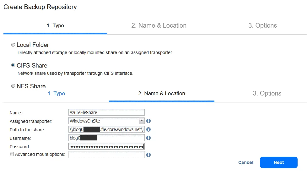 A continuación, creamos un nuevo repositorio de backups y utilizamos la misma información de conexión que encontramos anteriormente (en la interfaz web de Azure). Para crear un repositorio de backups en el recurso compartido SMB remoto, seleccione la opción de CIFS share en la interfaz web de NAKIVO Backup & Replication en el primer paso del asistente Create Backup Repository y complete los demás pasos del asistente.