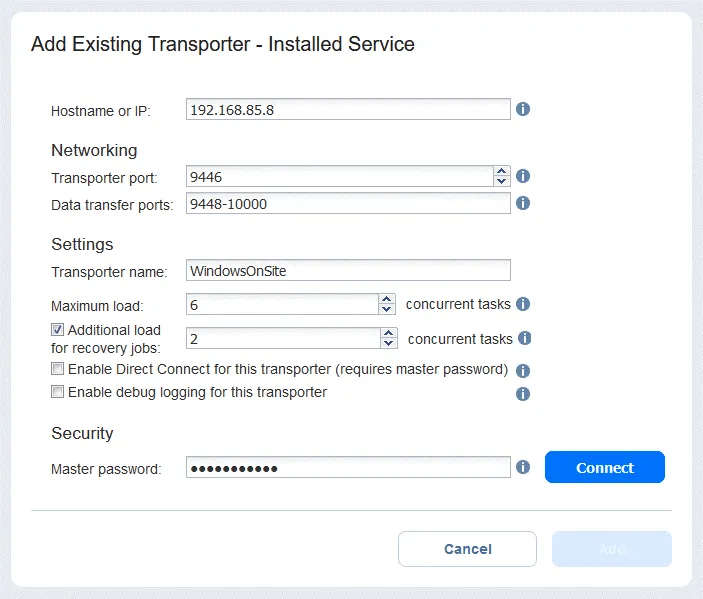 Introduzca la dirección IP del equipo en el que está instalado el Transporter local (in situ). Introduzca el nombre del Transportador, por ejemplo, WindowsOnSite. Introduzca la contraseña maestra si es necesario.