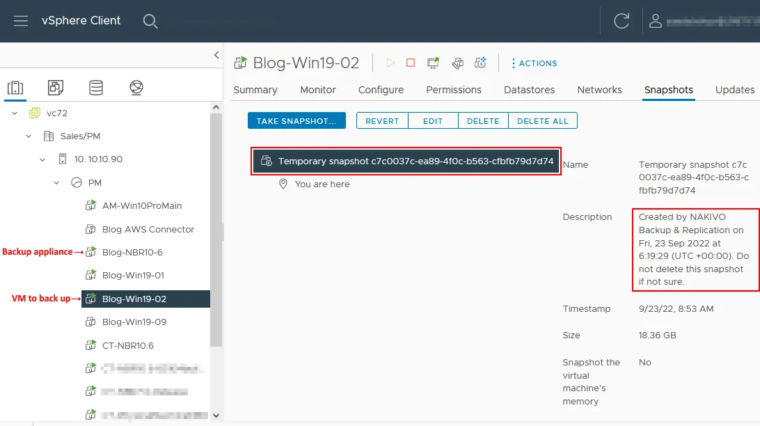 Si abrimos VMware vSphere Client, podemos ver la instantánea temporal creada para nuestra VM Win19-02, de la que se está haciendo backup. Se proporciona una descripción de la instantánea con información sobre la aplicación que desencadenó su creación.