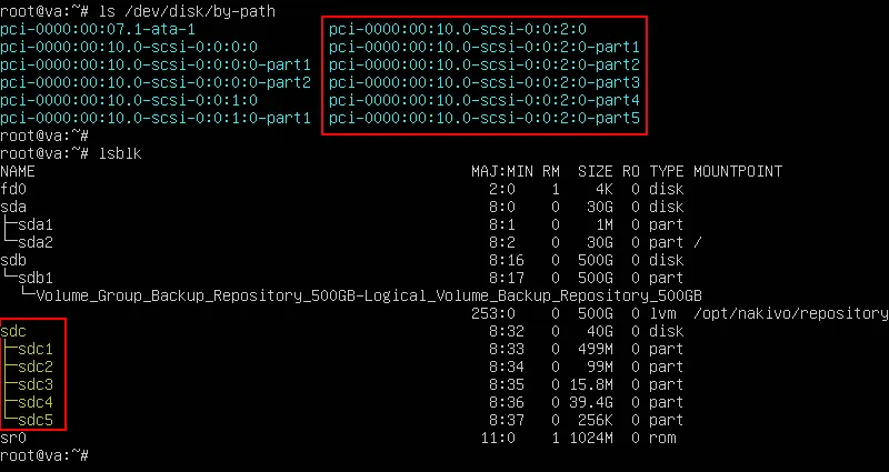 El disco SCSI conectado llamado sdc contiene 5 particiones. Puede ver que el tamaño del disco es de 40 GB, que es igual al tamaño que comprobamos antes en la interfaz web al gestionar el job de backups.