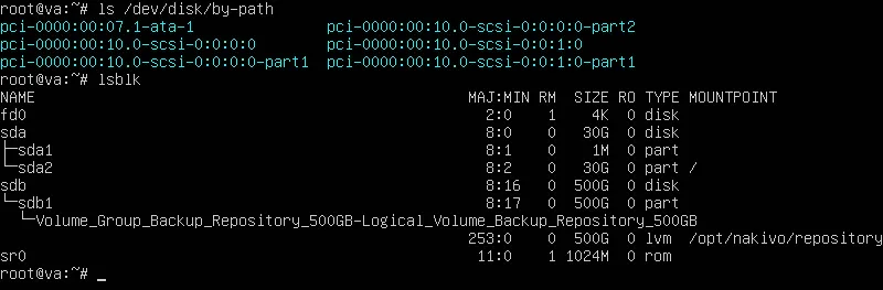 Iniciemos sesión en Linux instalado en el appliance virtual de la solución NAKIVO y comprobemos los dispositivos de almacenamiento en bloque conectados a esta máquina con los comandos: