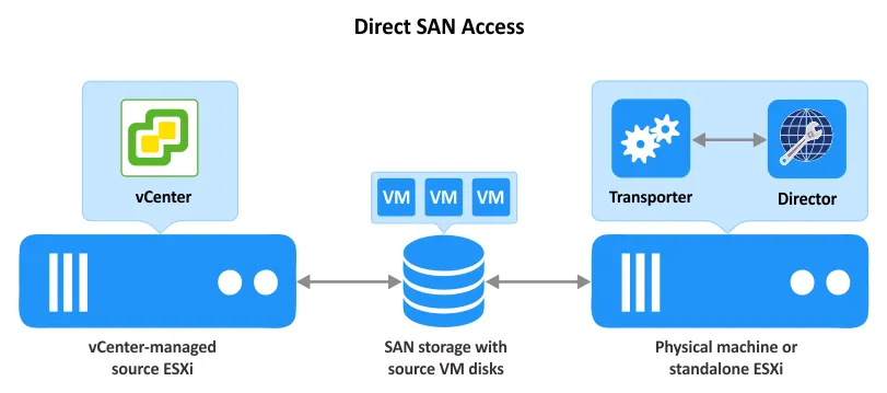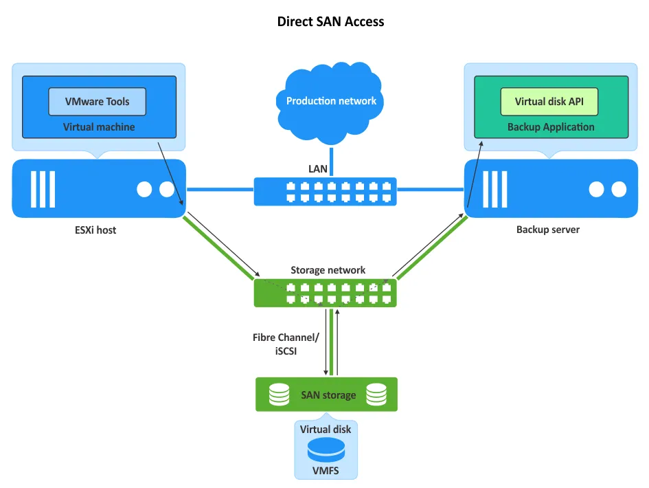 - El modo de transporte Direct SAN es la forma más rápida de hacer backup de VMware VMs desplegadas en hosts ESXi conectados a una SAN. Este modo también reduce la carga de las redes y el hardware de producción.
