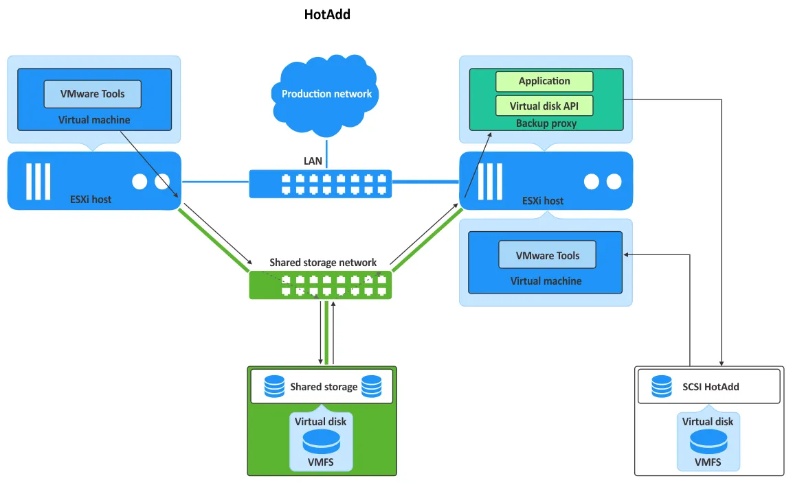 Cuando se copian datos a través de una red de área local (LAN), se utilizan los modos de transporte NBD (Network Block Device) y NBDSSL (NBD con SSL). Sin embargo, en esta entrada de blog, nos interesan los modos de transporte sin LAN como Direct SAN y HotAdd. Estos modos permiten al software de backups leer los datos directamente desde el almacenamiento conectado a los hosts ESXi evitando las redes LAN.