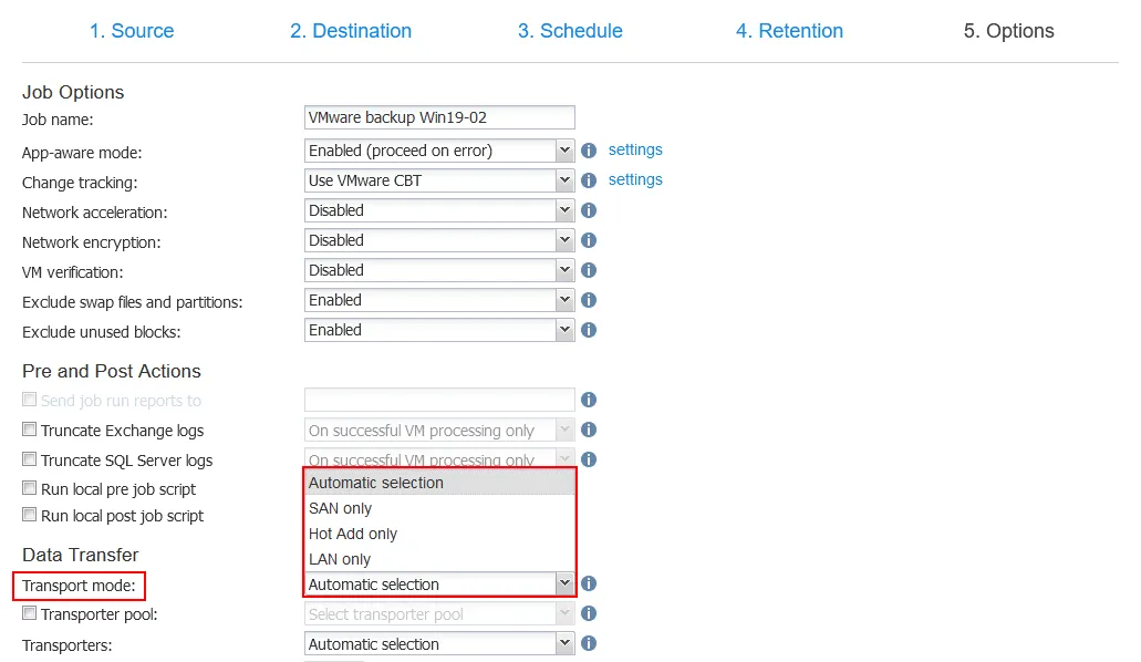 En la solución NAKIVO, puede seleccionar el modo de transporte en el asistente para hacer backups de VMware. El modo de transporte puede seleccionarse automáticamente o de forma manual(Automático es la opción por defecto). Nuestra configuración de VMware vSphere sólo es compatible con el modo HotAdd para hacer backups de VM sin LAN.