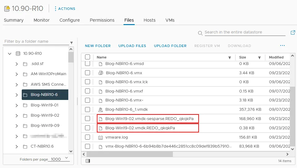 También hay archivos temporales almacenados en el directorio con archivos VM del appliance de backup de NAKIVO. Estos archivos están relacionados con la instantánea del disco virtual montado que se utiliza para hacer backup de VM sin LAN con el modo de transporte HotAdd.