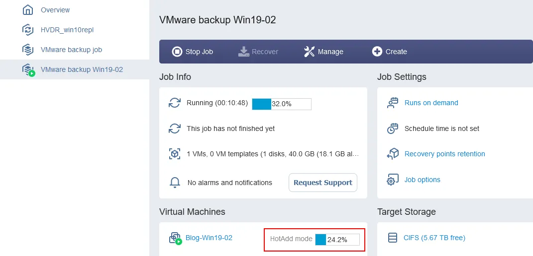 Cuando ejecutamos el job de backups, vemos que el modo de transporte HotAdd está seleccionado para backups de VM sin LAN. La máquina virtual de la que estamos haciendo backup de contiene un disco virtual, cuyo tamaño es de 40 GB. El espacio utilizado en este disco es de 18,1 GB.
