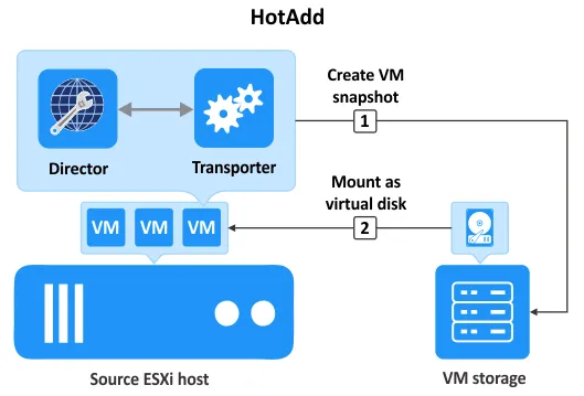 HotAdd, también llamado SCSI HotAdd, es una capacidad de VMware que permite conectar un dispositivo físico o virtual mientras una máquina virtual se está ejecutando (sin ningún tiempo de inactividad). Puede añadir en caliente dispositivos como procesadores virtuales, memoria y discos en una VMware VM mientras la VM se está ejecutando. En el caso de utilizar esta tecnología de VMware para hacer backups sin pasar por LAN, se monta (es decir, se «añade en caliente») una instantánea de una máquina virtual de origen como disco virtual en la máquina virtual en la que está instalada la aplicación de backup (la máquina virtual de destino).