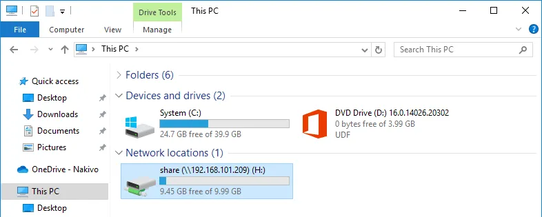 Como ya se ha mencionado, los usuarios pueden introducir la ruta al recurso compartido para acceder a los archivos y carpetas compartidos. También es posible crear accesos directos a las carpetas compartidas. Sin embargo, esta forma puede no ser la más conveniente para algunos usuarios. En este caso, puede asignar un recurso compartido de archivos como unidad de red y acceder a esta unidad de red en My Computer o This PC (Windows Explorer) del mismo modo que accedería a los volúmenes de disco locales.