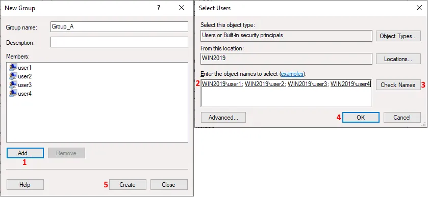 - Introduzca el nombre de los usuarios y grupos para los que desea configurar el acceso. En nuestro caso, introducimos Group_A.