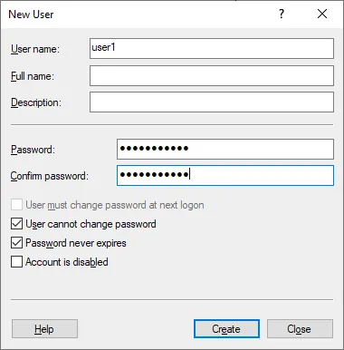 - Introduzca un nombre de usuario, que se utilizará para la autenticación de usuario al acceder a un recurso compartido de Windows. Tenga en cuenta que esta cuenta también se puede utilizar para iniciar sesión en el equipo Windows Server actual. El nombre de nuestro usuario es user1.
