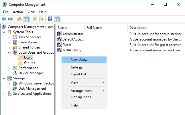 - Después de seleccionar Users, haga clic con el botón derecho del ratón en el espacio vacío del panel derecho y haga clic en New User en el menú contextual.