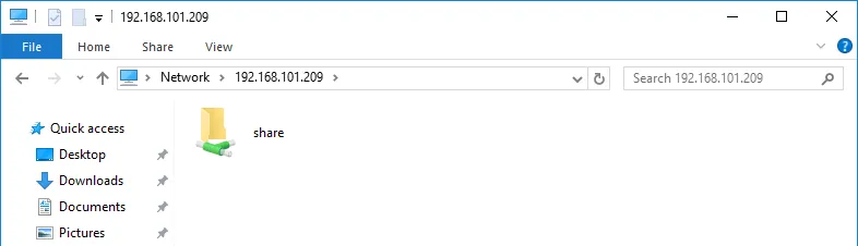 - Acceda al servidor de recursos compartidos en el Explorador de Windows como se ha explicado anteriormente. Introduzca el nombre del servidor o la dirección IP en la barra de direcciones, por ejemplo, \192 .168.101.209