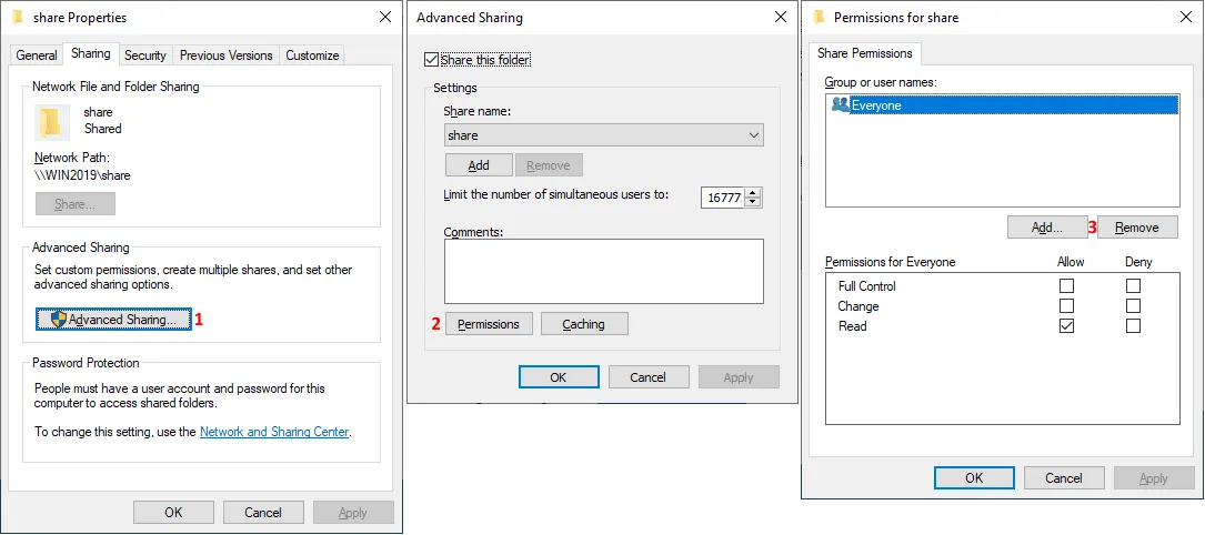 - Haga clic en OK para guardar los permisos del recurso compartido de Windows y cierre la ventana Permissions.