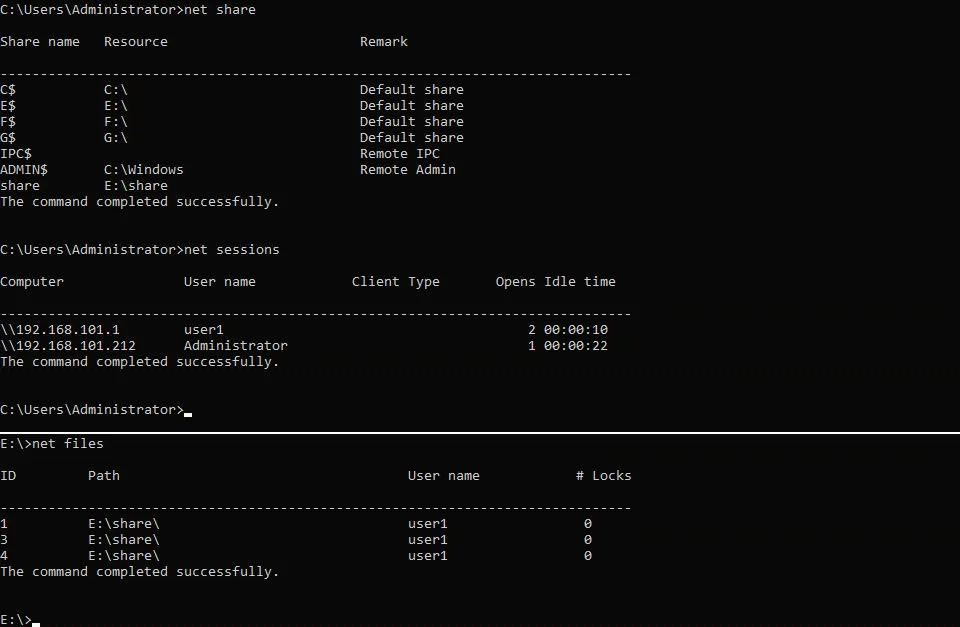 - Cierre los archivos abiertos por los usuarios definiendo el id del archivo (el id se muestra con el comando net files que puede ver en la captura de pantalla anterior):