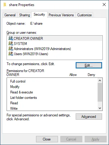 - Seleccione la pestaña Security en la ventana Properties de la carpeta compartida. Los permisos NTFS por defecto están configurados para CREATOR OWNER, SYSTEM, Administrators y Users.