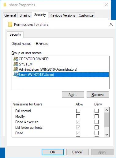 - Haga clic en Add para agregar los usuarios y grupos necesarios para configurar el acceso al recurso compartido SMB de Windows para ellos.