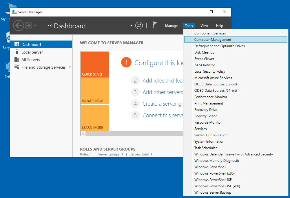 Abra la ventana de Computer Management, a la que puede acceder yendo a Server Manager > Tools > Computer Management. También puede ejecutar el comando compmgmt.msc en CMD.