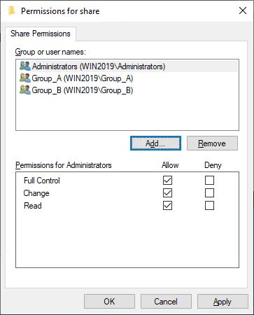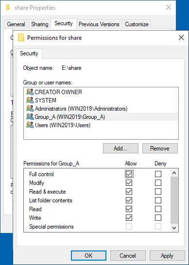 - Podemos ver Group_A en la lista de nombres de grupos o usuarios en la ventana Permissions para nuestra carpeta compartida.