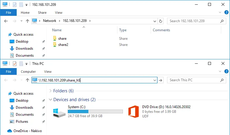 El flujo de trabajo para crear un recurso compartido SMB oculto de Windows es el mismo. La diferencia está en el nombre del recurso compartido. Añada el carácter $ al final de un nombre compartido para que este directory compartido quede oculto, por ejemplo, share_h$. Un recurso compartido oculto no se muestra cuando se navega por un servidor de archivos a través de la red añadiendo la dirección IP o el nombre del servidor(\192.168.101.209 o \Server2019, por ejemplo).