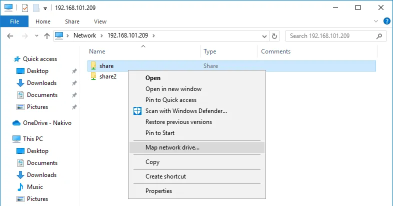 - Haga clic con el botón derecho en una carpeta compartida que desee conectar como unidad de red y haga clic en Map network drive.