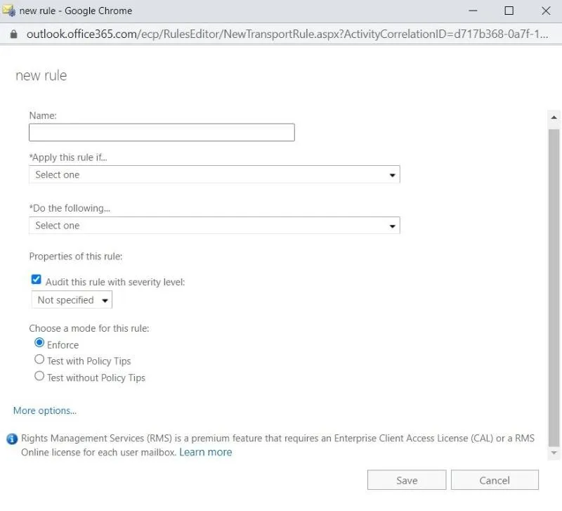Mediante las reglas de flujo de correo, puede eliminar el cifrado de correo electrónico aplicado por un usuario de su organización en mensajes o archivos adjuntos. Siga los pasos que se indican a continuación para crear la regla de flujo de correo: