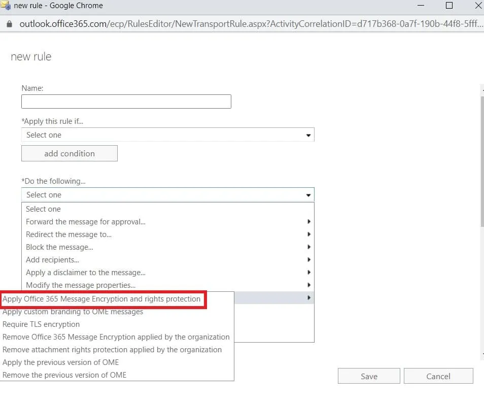 - Seleccione Aplicar cifrado de mensajes de Office 365 y protección de derechos.