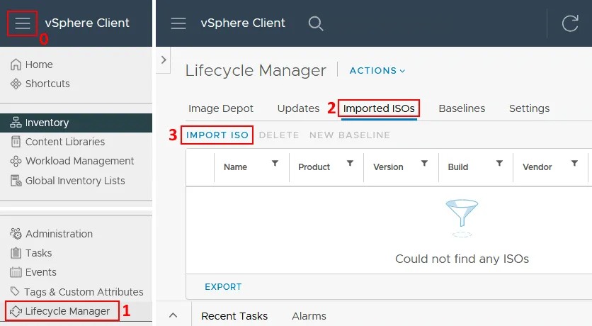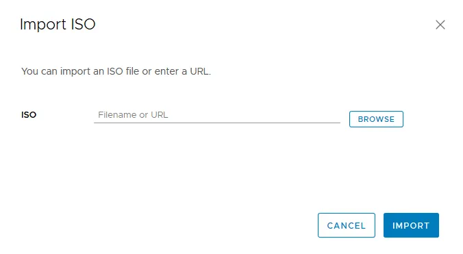 - Una vez que haya abierto VMware Lifecycle Manager en vSphere Client, seleccione la pestaña Imported ISOs y haga clic en Import ISO.