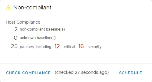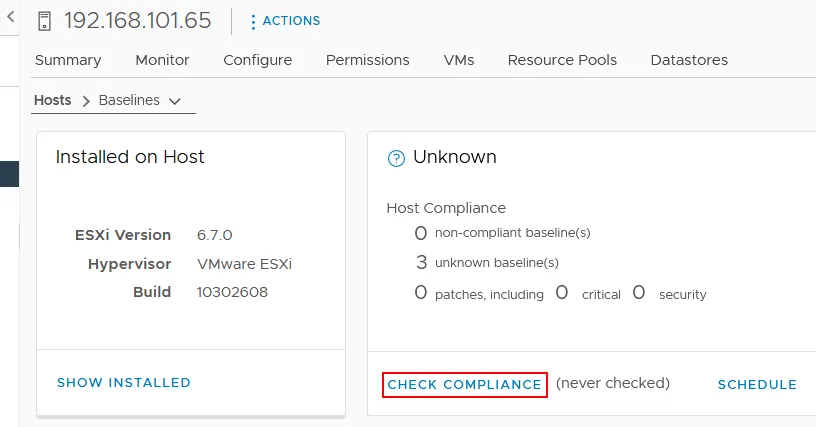 - Ahora hay que comprobar el cumplimiento. Este paso es necesario para comprobar si el host ESXi ya tiene instalada la actualización. Si ve el estado no conforme, significa que la actualización no está instalada en su host ESXi. Haga clic en Comprobar conformidad.