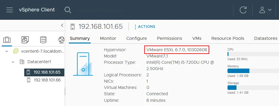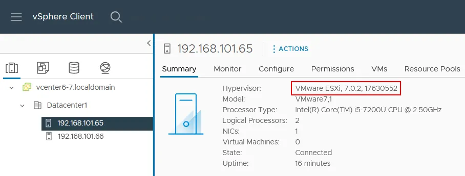 Vamos a actualizar el host ESXi con dirección IP 192.168.101.65. Seleccione el host ESXi necesario y compruebe la versión actual del hipervisor. Como puede ver en la siguiente captura de pantalla, la versión actual de nuestro host ESXi antes de la actualización es 6.7.0 build 10302608. Si desea ampliar varios hosts ESXi, puede seleccionar un clúster o un centro de datos.