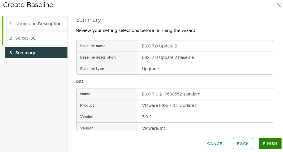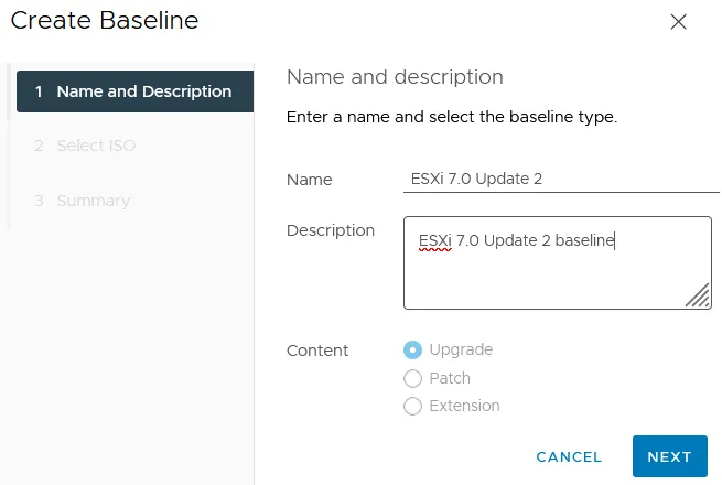 Nombre y Descripción. Introduzca el nombre y la descripción de la línea de base, por ejemplo, ESXi 7.0 Update 2 y línea de base ESXi 7.0 Update 2.
