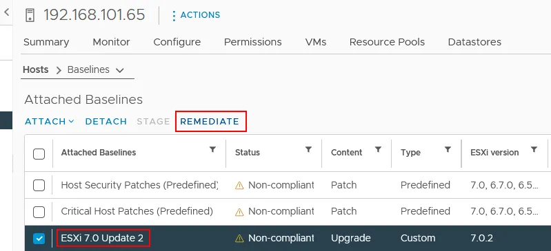 - En la sección Líneas de base adjuntas, seleccione su línea de base de ESXi 7.0 Actualización 2 creada anteriormente y haga clic en Remediar para iniciar el proceso de actualización de ESXi 6.7 a 7.0.