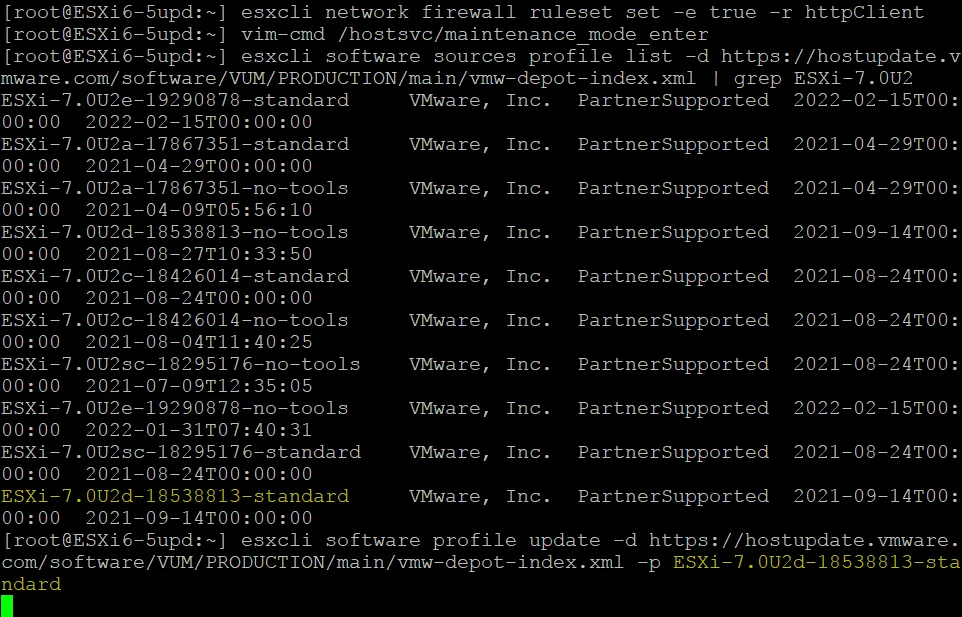 esxcli software profile update -d https://hostupdate.vmware.com/software/VUM/PRODUCTION/main/vmw-depot-index.xml -p ESXi-7.0U2d-18538813-standard