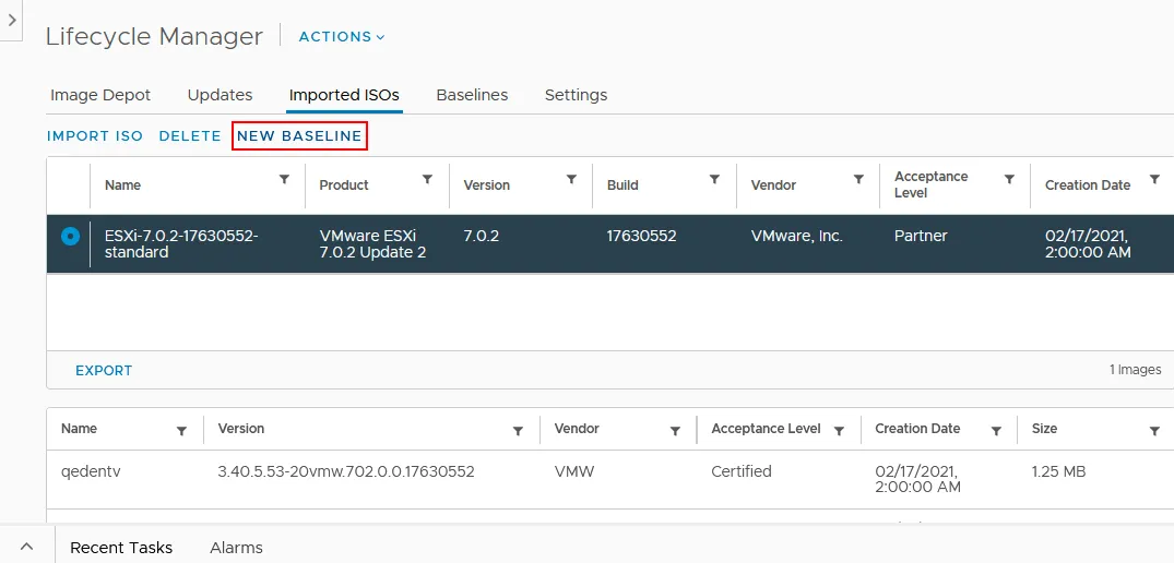 Tras importar el archivo ISO, podrá ver la imagen de instalación de ESXi 7.0 Update 2 en la pestaña Imported ISOs.