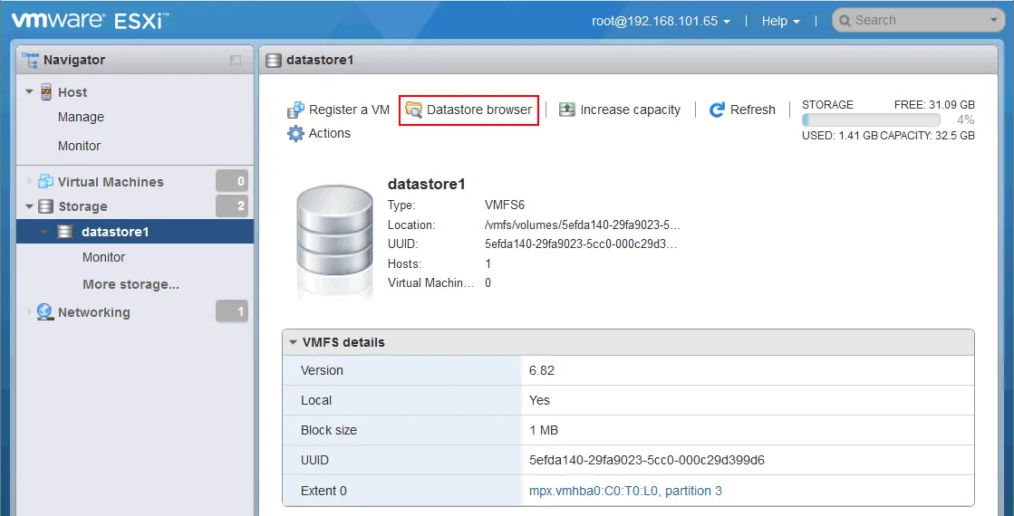 - Vaya a Storage > Datastores, seleccione el almacén de datos(datastore1 en este ejemplo) y haga clic en Datastore Browser.