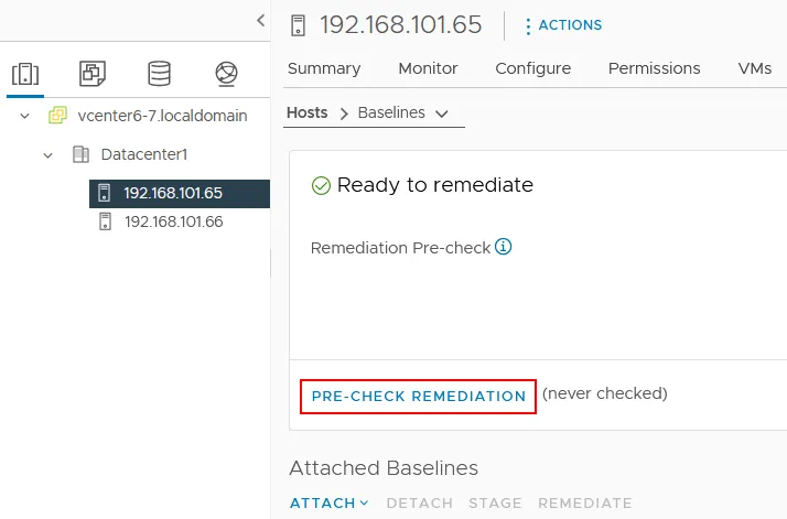 Una vez creada la línea de base, debe adjuntarla a los hosts ESXi que desea actualizar. Como recordará, en este tutorial vamos a actualizar un único host ESXi.