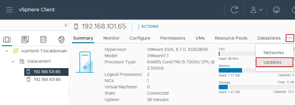 - Vuelva a la pantalla Hosts y clusters, seleccione el host ESXi que debe ser actualizado(192.168.101.65 en nuestro caso), y en la esquina superior derecha de la interfaz, haga clic en la pestaña Actualizaciones.