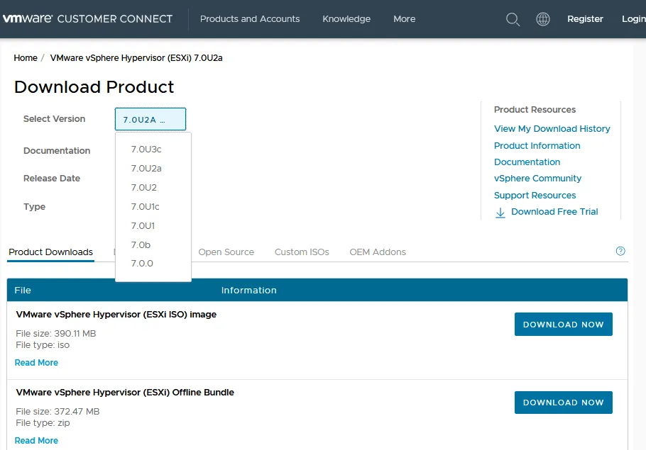 - Descargue el paquete sin conexión de ESXi 7.0 Update 2 del sitio web de VMware. El archivo zip del paquete offline está disponible junto con la imagen de instalación ISO de ESXi. Puede seleccionar la versión necesaria en la lista desplegable que contiene ESXi 7.0, ESXi 7.0 Update 1, ESXi 7.0 Update 2 y otras versiones. En este ejemplo, el nombre del archivo del paquete sin conexión de VMware vSphere Hypervisor (ESXi) descargado es: VMware-ESXi-7.0U2d-18538813-depot.zip