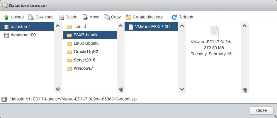 - Seleccione un directorio para almacenar los archivos del paquete o cree un nuevo directorio en el navegador del almacén de datos. Creamos el directorio ESXi7-bundle para almacenar el archivo VMware-ESXi-7.0U2d-18538813-depot.zip archivo. Haga clic en Cargar para examinar un archivo comprimido y cargarlo en el directorio seleccionado del almacén de datos.