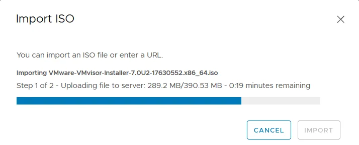 Una vez seleccionado el archivo ISO, se inicia el proceso de importación. En este ejemplo, se utiliza el archivo VMware-VMvisor-Installer-7.0U2-17630552.x86_64.iso.