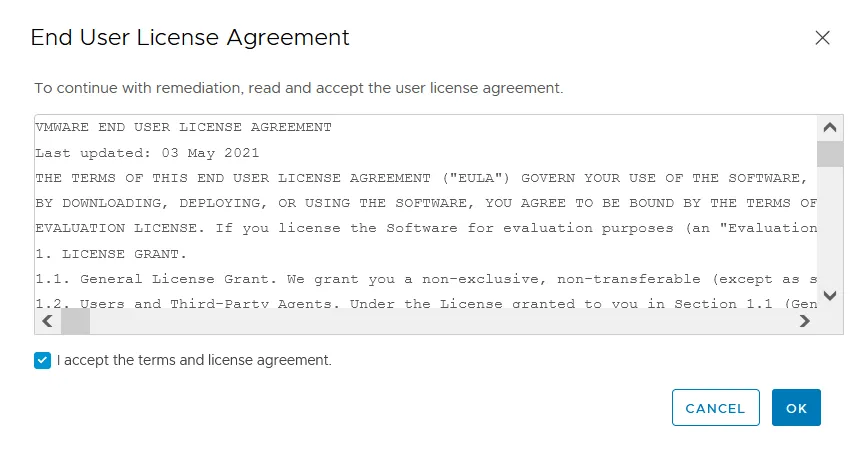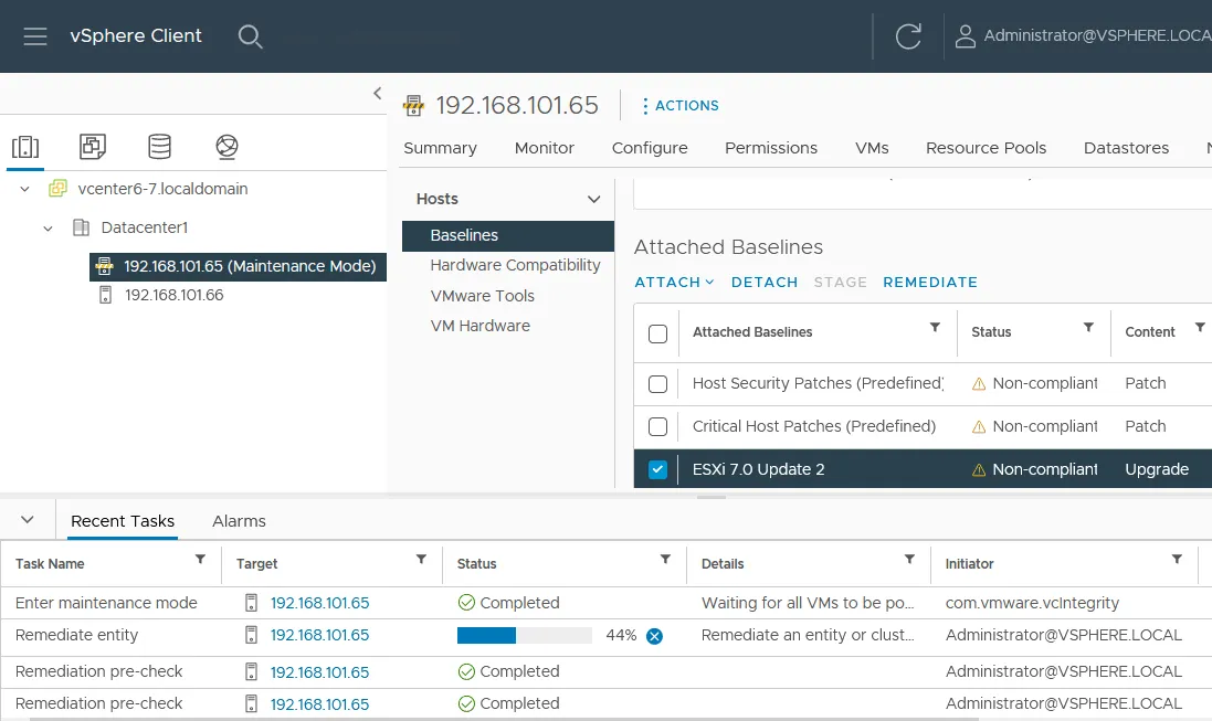 - Asegúrese de que su host ESXi está seleccionado y pulse Remediate para actualizar ESXi 6.7 a 7.0. No olvide que las máquinas virtuales deben estar apagadas o migradas del host ESXi que se está actualizando.