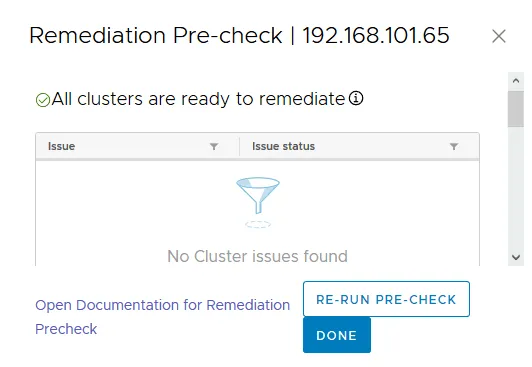 Como se puede ver en la siguiente captura de pantalla, no hay problemas después de ejecutar la comprobación previa de corrección. Pulse Hecho y vaya a actualizar el host ESXi.