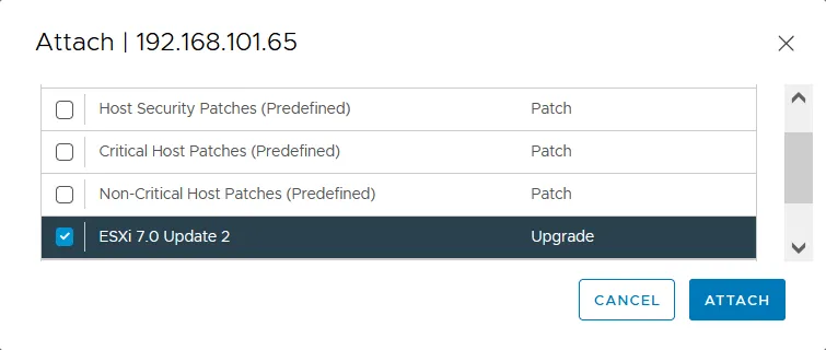 Seleccione la línea de base de ESXi7.0 Update 2 que ha creado anteriormente y haga clic en Adjuntar. Si hay otras líneas de base adjuntas, elimínelas seleccionándolas y haciendo clic en Eliminar.