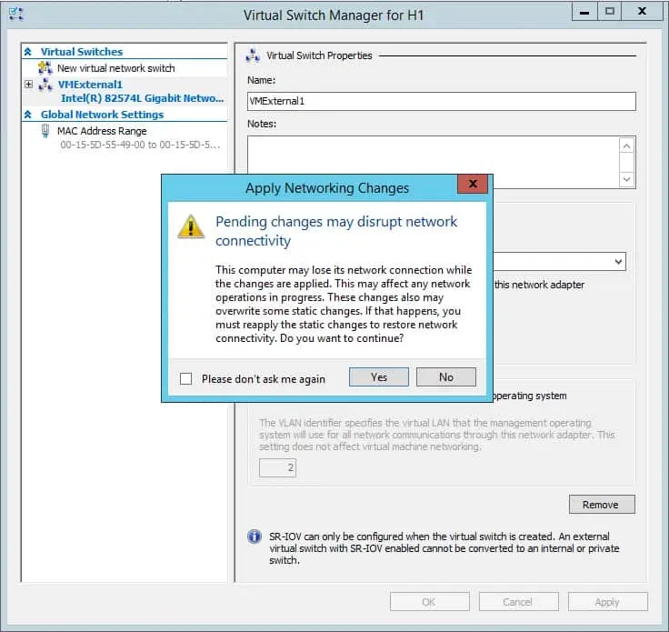 Además, puede elegir permitir que el sistema operativo de gestión comparta este adaptador de red, lo que significa que la conectividad de gestión a su host Hyper-V también utilizará este adaptador. Anule la selección de esta casilla si dispone de un adaptador de red de gestión independiente o si desea crear uno manualmente más adelante. Si anula la selección, aparecerá un mensaje advirtiéndole de que puede perder el acceso al host a menos que disponga de otro adaptador de red utilizado para la comunicación de gestión.