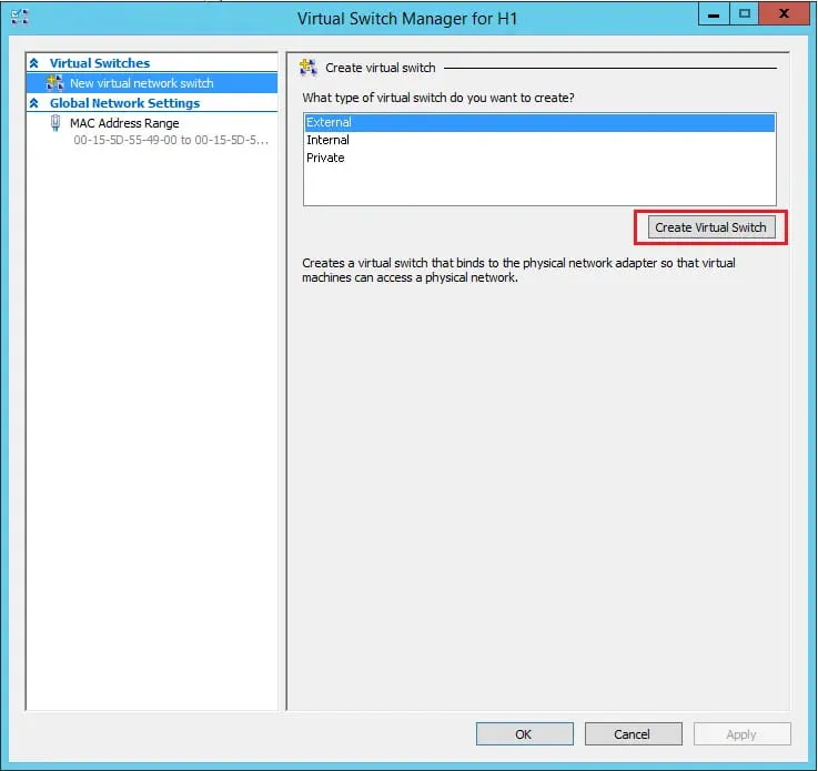 - Haga clic en Crear conmutador virtual. Aquí puede elegir el tipo de conmutador virtual que desea crear. Este ejemplo explica cómo crear un switch externo, ya que este tipo es necesario para permitir la conectividad entre las máquinas virtuales invitadas y la red física.