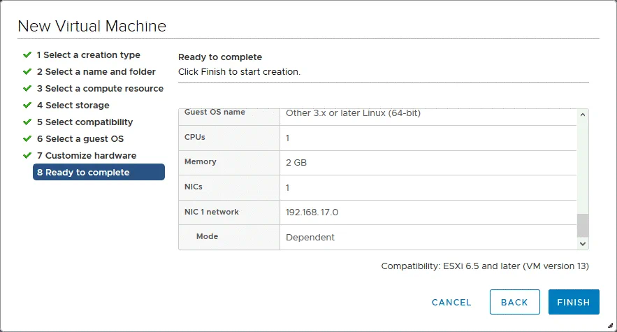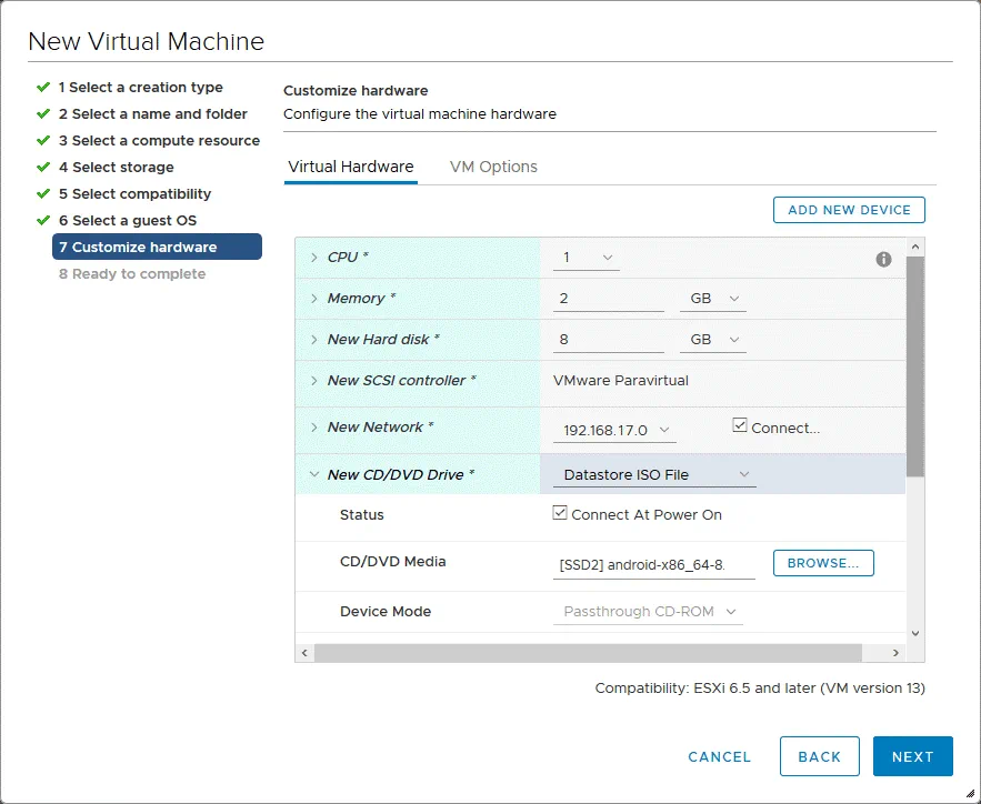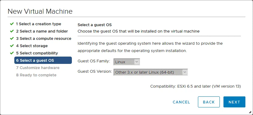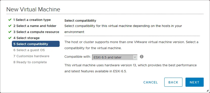 5. Seleccione la compatibilidad. Seleccione la versión de hardware necesaria para su VMware VM Android. Cuanto mayor sea la versión de VM que seleccione, mejor rendimiento obtendrá. Las funciones más recientes de VMware están disponibles para las últimas versiones de hardware de virtual machines. La versión de Android que se instala en VMware ESXi en este ejemplo es compatible con la versión de hardware de ESXi 6.5 VM. Por lo tanto, se selecciona ESXi 6.5 y posteriores como la versión de hardware virtual.