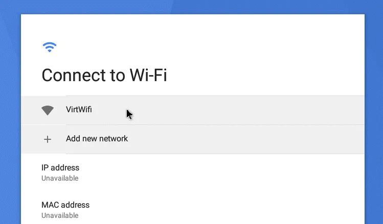 En la siguiente pantalla, deberías ver la red VirtWiFi. Este es el nombre de su red a la que un virtual controlador Ethernet de su Android VMware VM está conectado. Usted puede tratar de utilizar un adaptador USB Wi-Fi y conectar el adaptador directamente a la VM como se explica en nuestras entradas de blog sobre la instalación de Kali Linux en VMware y VirtualBox hypervisors. Para ello, inserte un adaptador Wi-Fi USB en el puerto USB de un ordenador físico que ejecute un VMware hyperviso (VMware ESXi o VMware Workstation) y utilice la función USB pass-through.